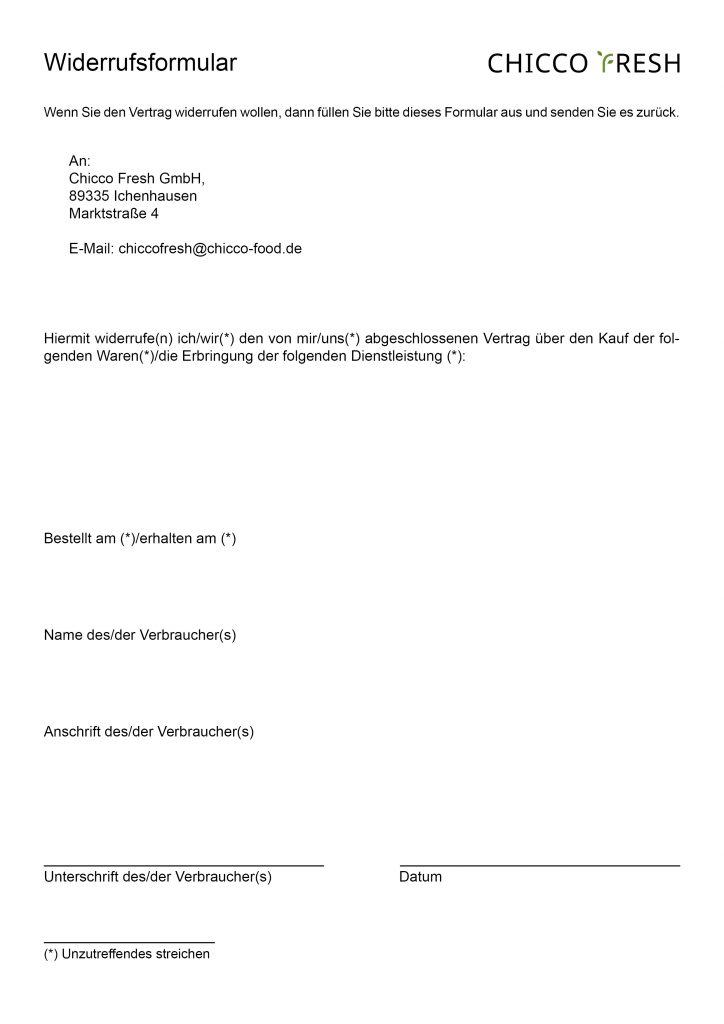 4. Widerruft der Kunde den Vertrag zahlt Chicco Fresh erhaltene Zahlungen unverzüglich und spätestens innerhalb einer Zeitspanne von vierzehn Tagen zurück, ab dem Zeitpunkt, zu dem die Widerrufsmitteilung erhalten wurde. Rückzahlungen können bis zum Erhalt bereits gesendeter Ware zurückbehalten werden oder bis der Nachweis der Rücksendung durch den Kunden erfolgt.